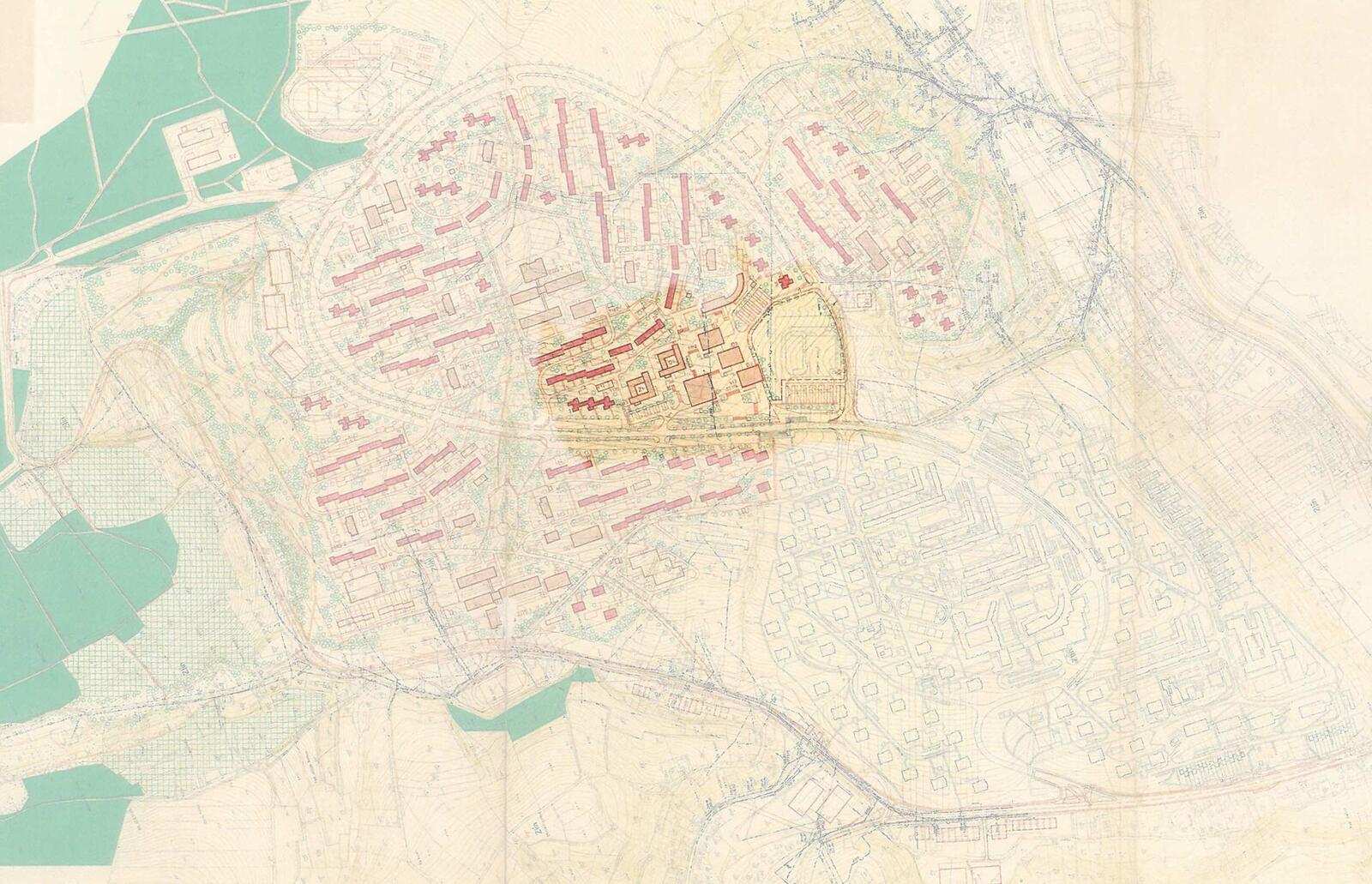 Rukopisný plán obytného souboru Jižní Svahy z roku 1979. V původním plánu je zvýrazněno území řešené připravovanou urbanistickou soutěží.