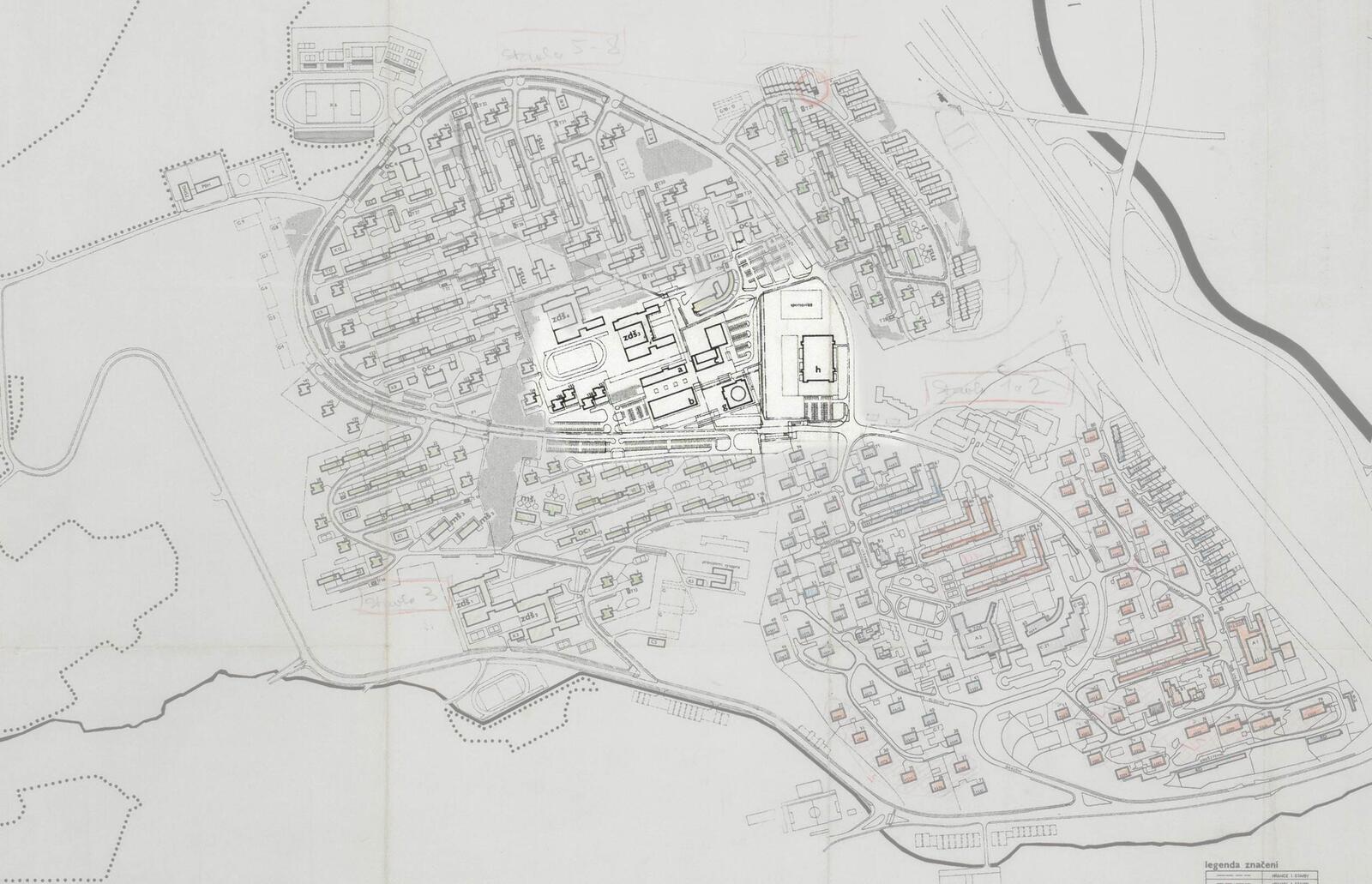 Plán na výstavbu druhé a třetí etapy sídliště Jižní Svahy z roku 1974. V původním plánu je zvýrazněno území řešené připravovanou urbanistickou soutěží.
