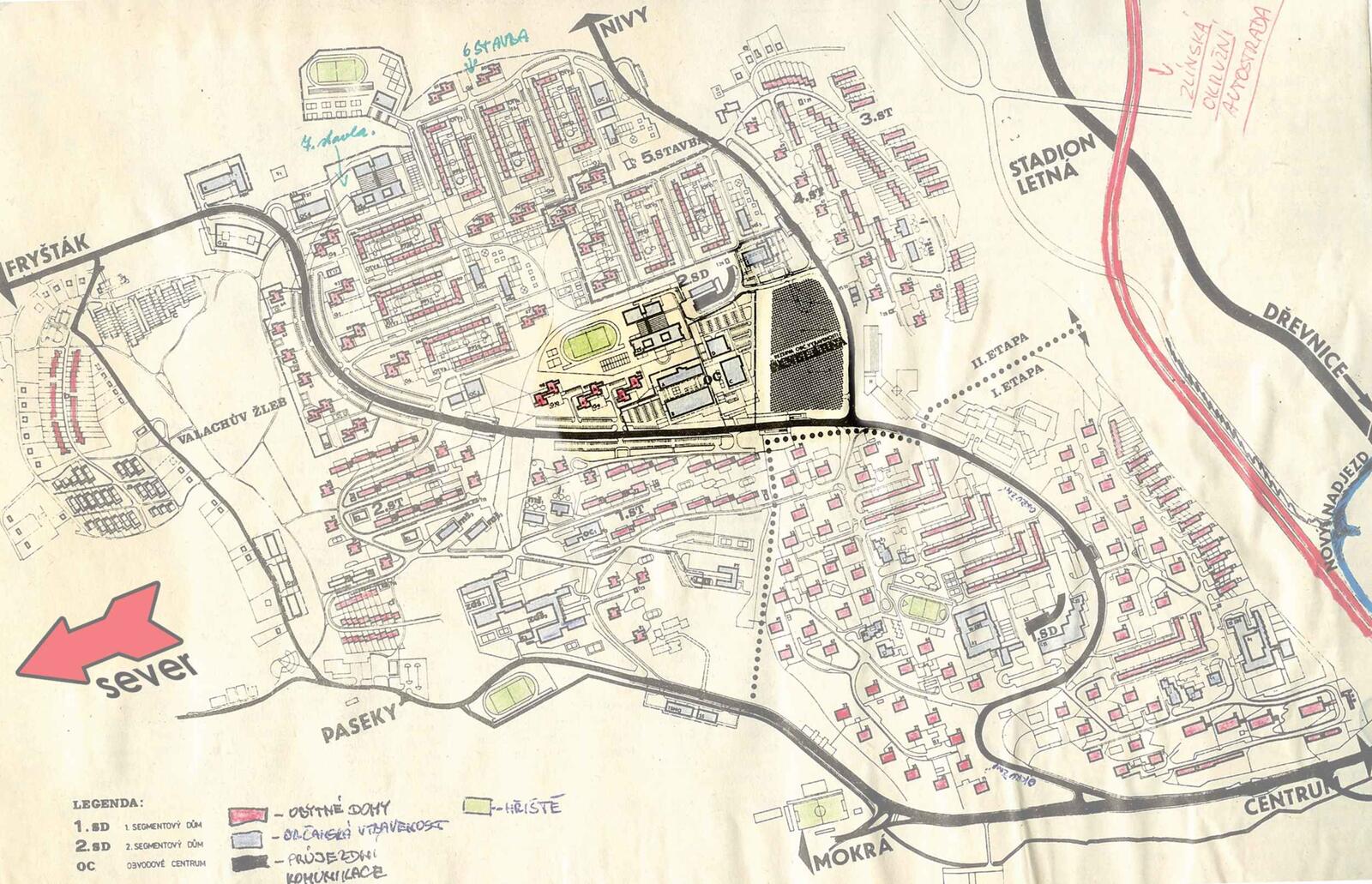 Zdroj: OS Jižní svahy. Gottwaldov II. Situace. [Dušan] Živocký, [František] Balajka, 1979. Dodatečně kolorovaná černobílá kresba. 1:2000, 420x690. MJVM, Zlín, bez evidence. Digitalizoval Libor Stavjaník.