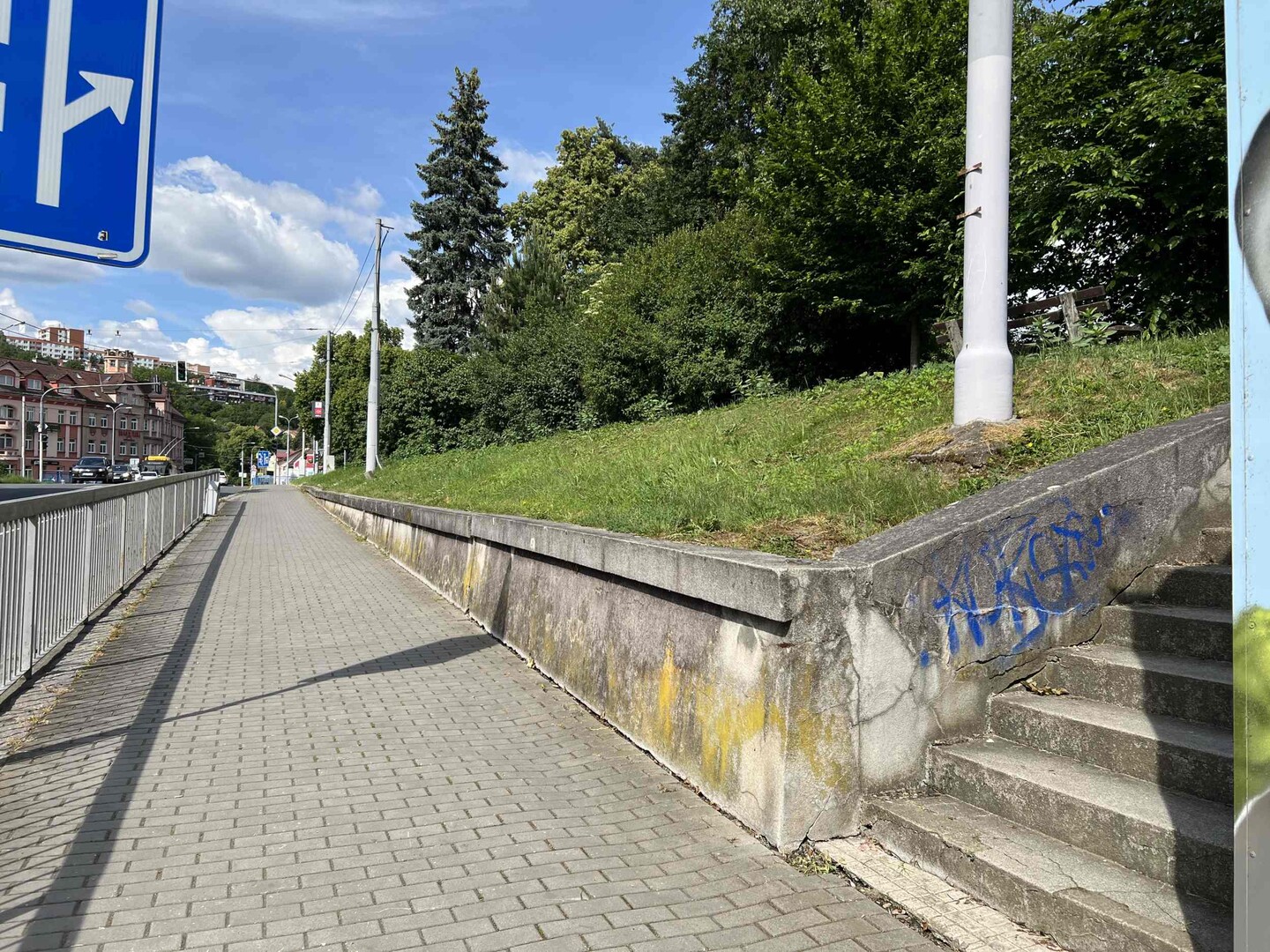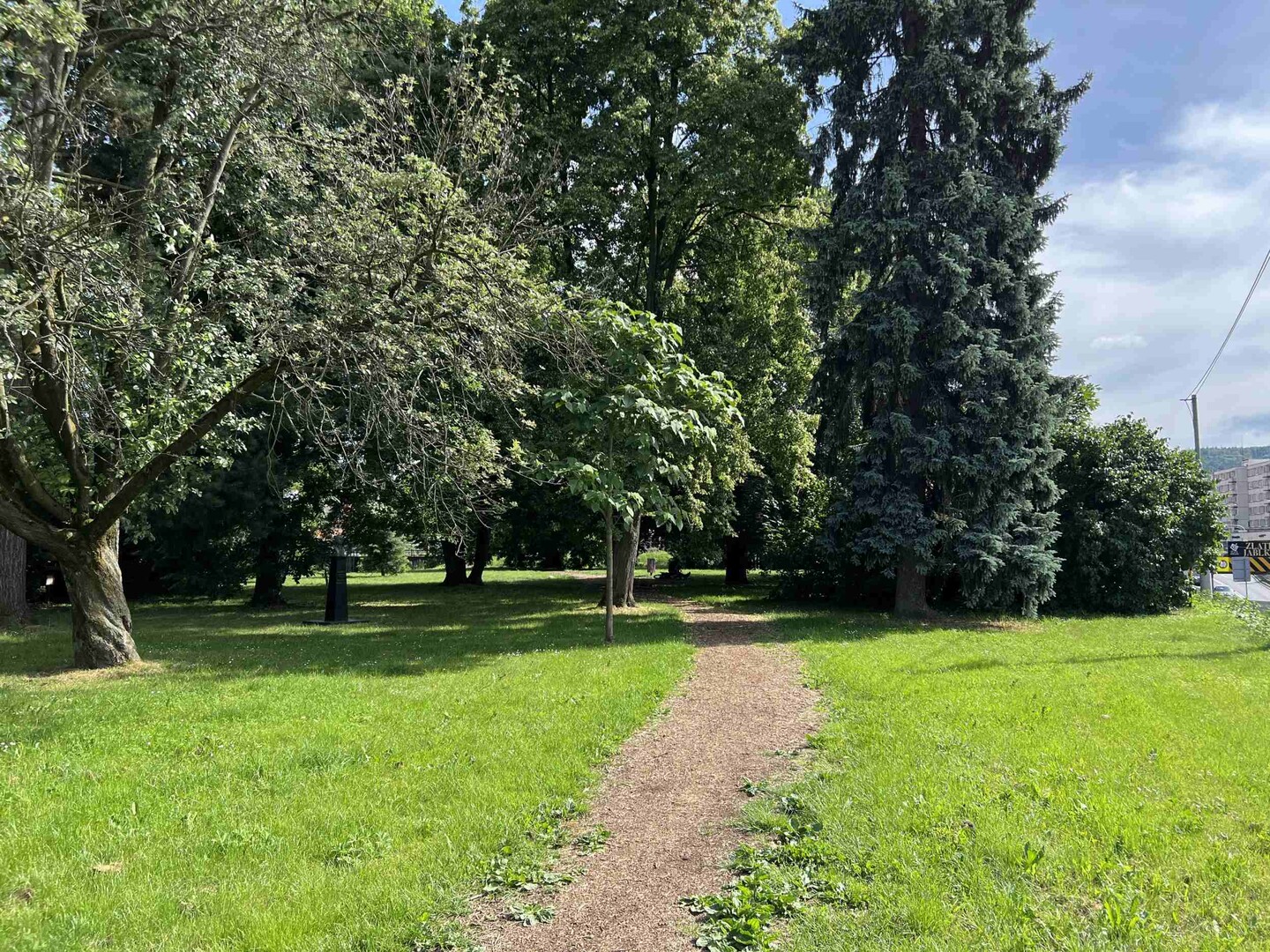 Chodníček ze štěrkomlatu je parkem veden nově, vyhýbá se stromům a prochází až k zrekonstruovanému rozšířenému schodišti.