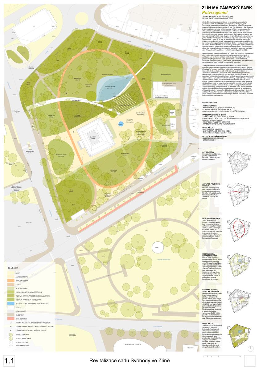 Zlín je mezi architekty znám hlavně díky jeho baťovské architektuře vyznačující se užitím betonových skeletů s výplní z režného cihelného zdiva a nebývale rozsáhlé aplikaci principů zahradních měst. Kořeny města jsou ale mnohem hlubší, a tato soutěž se dotýká jedné z jeho vůbec nejstarších částí, které vévodí zámek se symbolickým číslem popisným 1. Jedná se o prostředí přírodně-krajinářského parku panského sídla pro Zlín zcela netypické, až nečekané, zasazené mezi historický střed města a rozsáhlý areál továrních budov firmy Baťa.