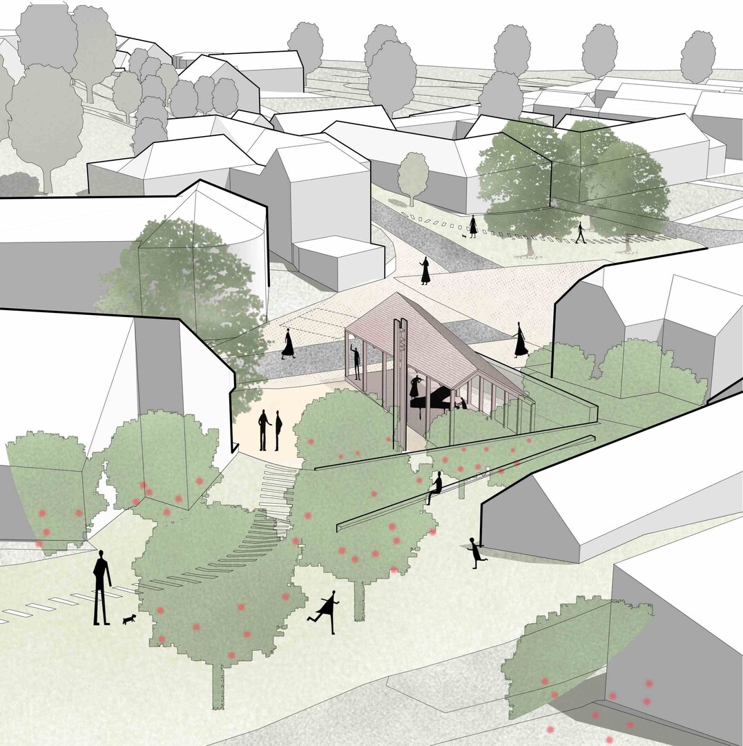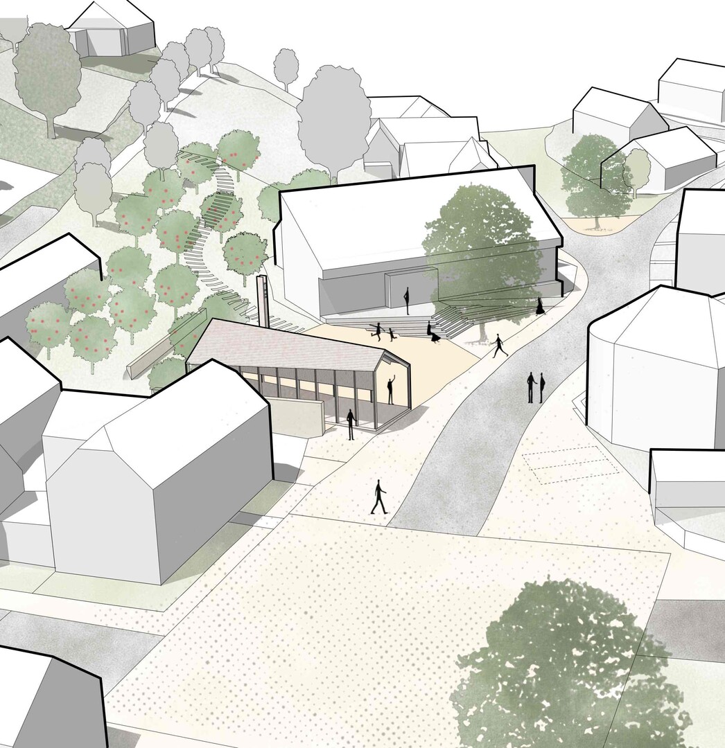 Revitalizace prostoru návsi místní části Lužkovice se v širším měřítku dotýká dopravního řešení křižovatky a navazujících prostranství. Samotné řešení plochy, která se nachází před rekonstruovaným společenským objektem, rozšiřuje jeho funkci o potřebný shromažďovací prostor. Ten je komponován z několika základních prvků – zpevněné plochy, pobytového schodiště před místní prodejnou, zelených teras, sadu, přístřešku – stodoly a zvoničky.