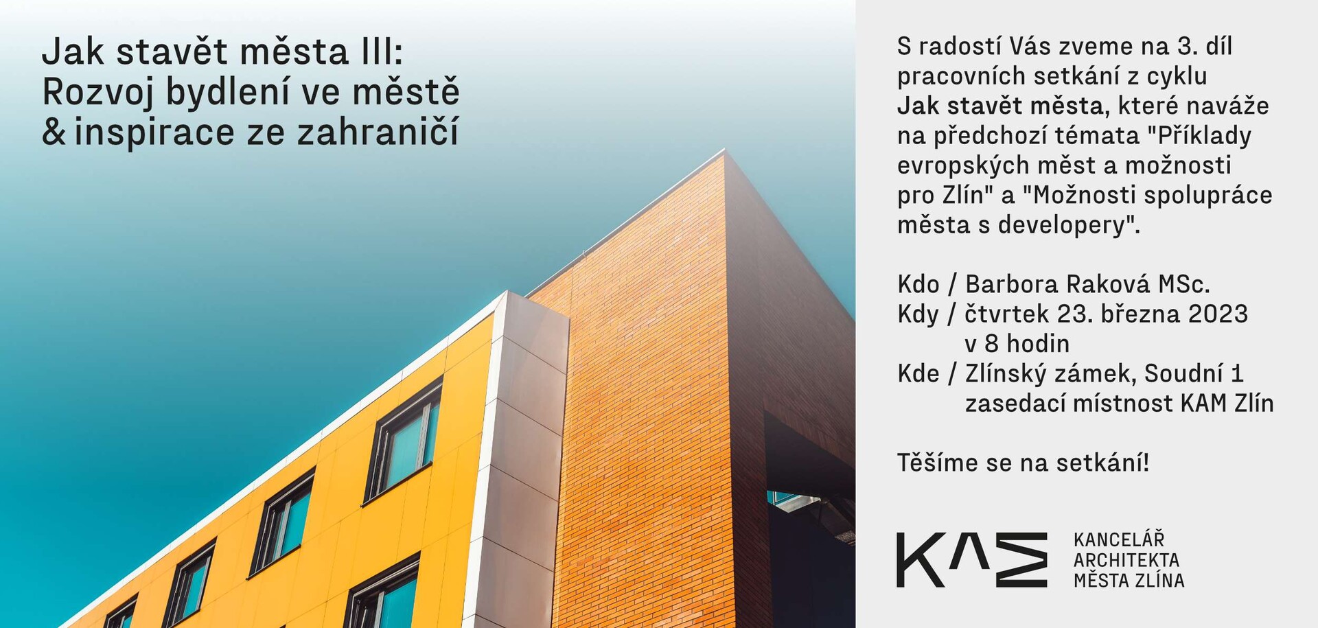 S radostí Vás zveme na 3. díl pracovních setkání z cyklu Jak stavět města, které naváže na předchozí témata "Příklady evropských měst a možnosti pro Zlín" a "Možnosti spolupráce města s developery".