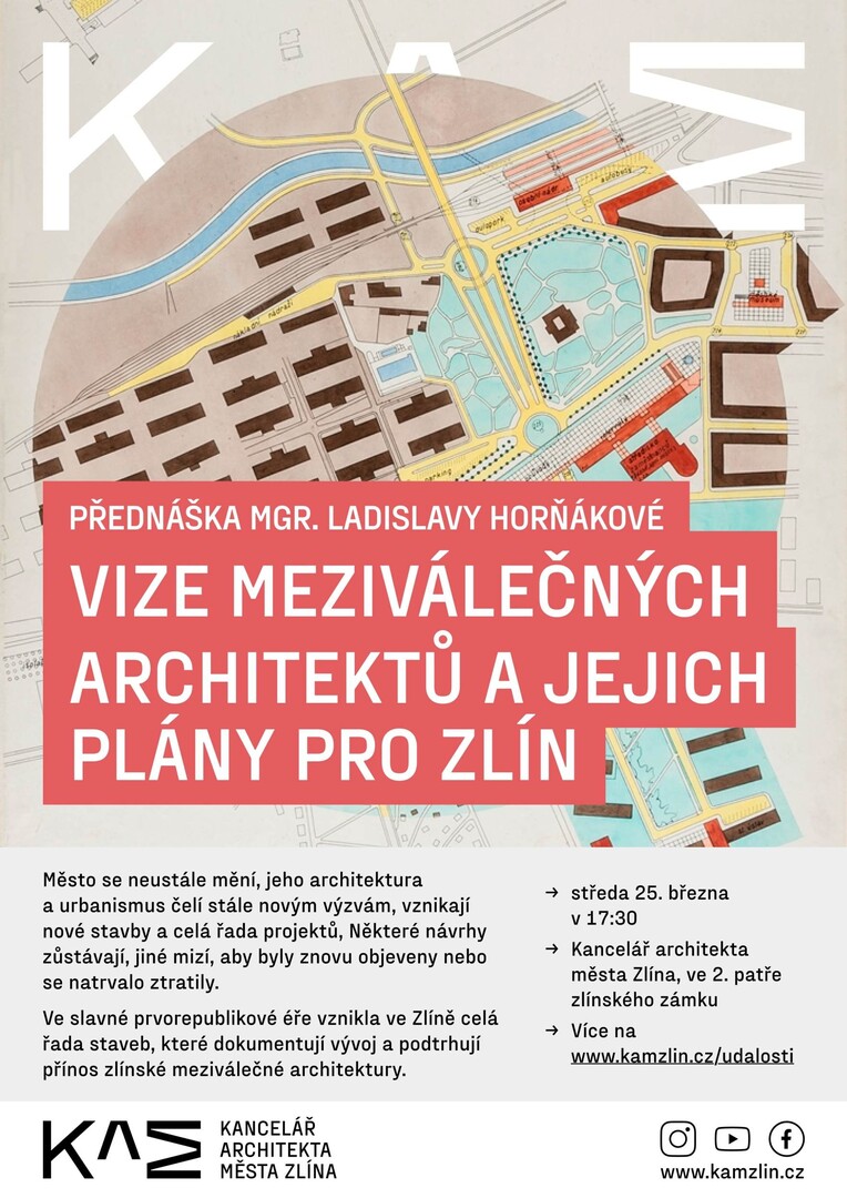 Z přednášky budou pořízeny fotografie k publikaci na sociálních sítích a webu KAM a také audiovizuální záznam pro následné zveřejnění na Youtube kanálu Kanceláře architekta města Zlína.