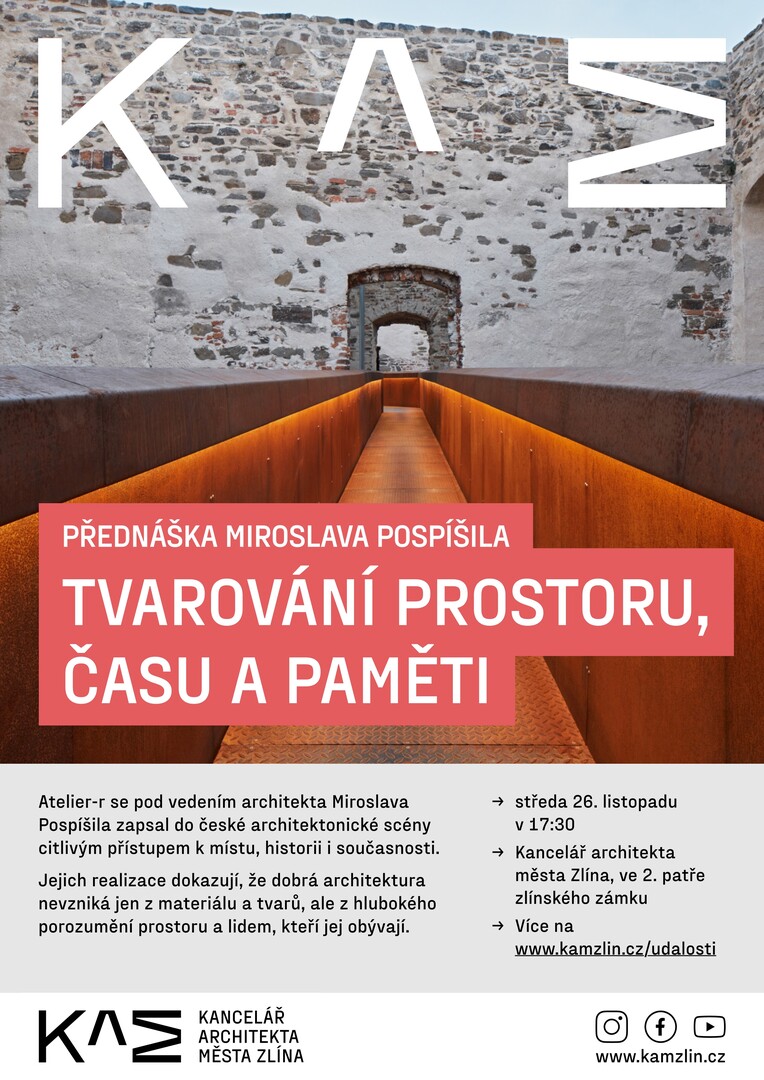 Z přednášky budou pořízeny fotografie k publikaci na sociálních sítích a webu KAM a také audiovizuální záznam pro následné zveřejnění na Youtube kanálu Kanceláře architekta města Zlína.